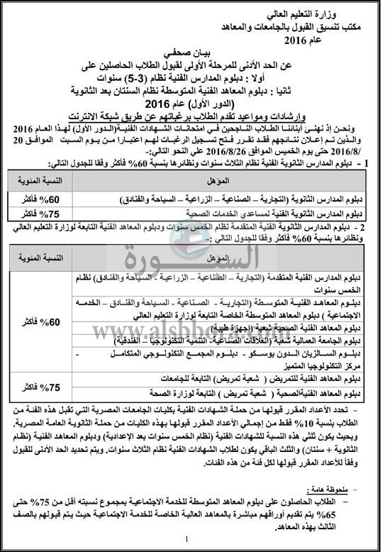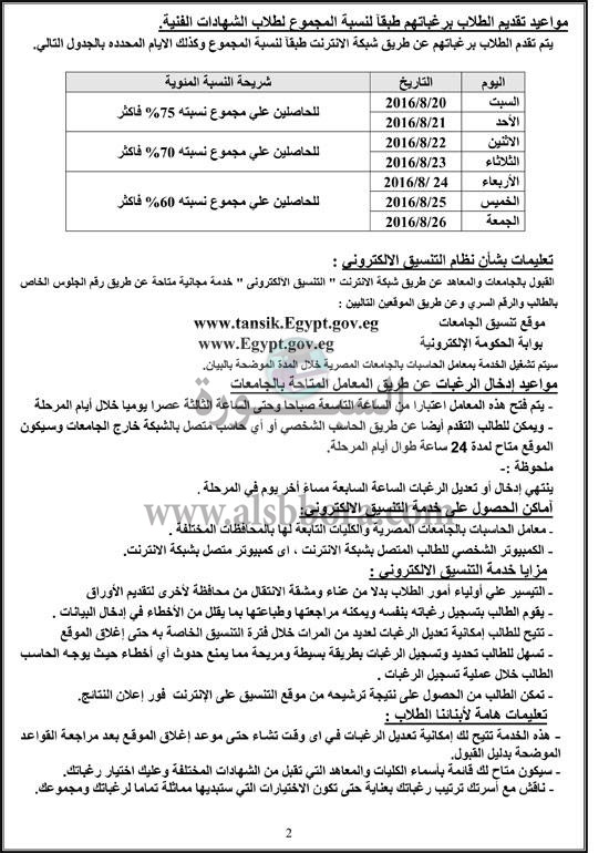 ثانيا: دبلوم المعاهد الفنية المتوسطة نظام السنتين بعد الثانوية الدور الأول عام 2016، وإرشادات ومواعيد تقدم الطلاب برغباتهم عن طريق شبكة الانترنت.