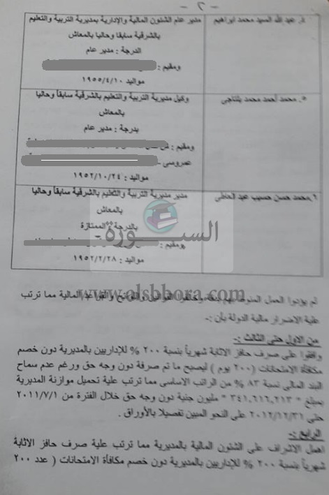 وتبين أن عبدالله السيد محمد، مدير عام الشئون المالية والإدارية بمديرية التربية والتعليم بالشرقية أهمل الإشراف على الشئون المالية بالمديرية مما ترتب عليه صرف حافز الإثابة شهريًا بنسبة 200% للإداريين بالمديرية دون خصم مكافأة الامتحانات (200) يوم ليصبح ما تم صرفه دون وجه حق ورغم عدم سماح البند المالي بنسبة 83% من الراتب الأساسي.