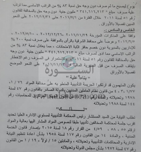 وجاء بأوراق القضية أن محمد أحمد بلتاجي، وكيل مديرية التربية والتعليم بالشرقية ومحمد حسن حبيب، وكيل أول الوزارة وافقا قبل إحالتهما للمعاش على 3 مذكرات صرف الحافز وقاما بعرضها على محافظ الشرقية بإقتراح الموافقة على صرف نسبة 200% للإداريين بالمديرية دون خصم مكافأة الامتحانات (200) يوم للإداريين بالمديرية ليصبح ما تم صرفه دون وجه حق ورغم عدم سماح البند المالي بنسبة 83% من الراتب الأساسي مما ترتب عليه تحميل موازنة المديرية بمبلغ 342 مليون جنيهًا تقريبًا دون وجه حق وبالمخالفة للقانون 51 لسنة 2011 والاستمرار في الصرف رغم الإخطار بإيقاف الصرف من قبل المديرية المالية.