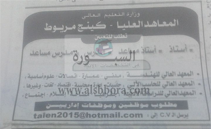 تعلن المعاهد العليا بكينج مريوط عن حاجتها الى أعضاء هيئة التدريس، وعلى الراعبين فى التقدم ارسال السيرة الذاتية على الايميل المنشور فى الاعلان بجريدة الاهرام اليوم الجمعة الموافق 19 اعسطس 2016.