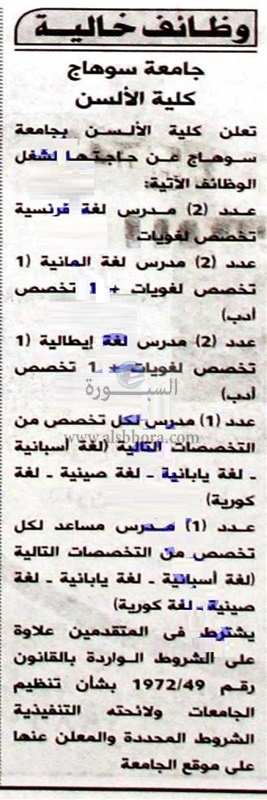 تعلن جامعة سوهاج عن حاجتها إلى أعضاء هية التدريس بكلية الألسن، وعلى الراغبين فى التقدم باليد باسم السيد أ.د/ المشرف علي الكلية، بإدارة شئون العاملين، في موعد غايته خمسه عشر يوماً من تاريخ نشر الاعلان .