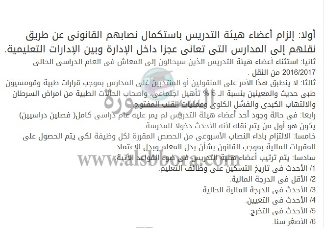 أولا: إلزام أعضاء هيئة التدريس باستكمال نصابهم القانونى عن طريق نقلهم إلى المدارس التى تعانى عجزا داخل الإدارة وبين الإدارات التعليمية.