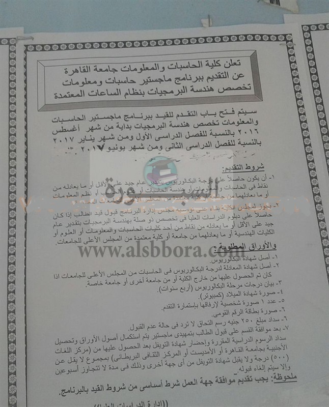 أعلنت كلية حاسبات ومعلومات بجامعة القاهرة شروط القبول بماجستير حاسبات ومعلومات تخصص هندسة البرمجيات بنظام الساعات المعتمدة، وبدأت الكلية قبول الطلاب بداية من شهر أغسطس للفصل الدراسي الأول والتقديم لفصل الدراسي الثاني ابتداءً من يناير 2017.