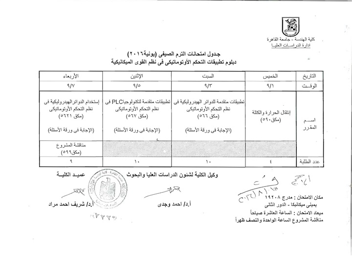 أعلن قسم الدراسات العليا بكلية الهندسة بجامعة القاهرة جدول امتحانات التيرم الصيفي بدبلومة تطبيقات التحكم الأوتوماتيكي في نظام القوى الميكانية.