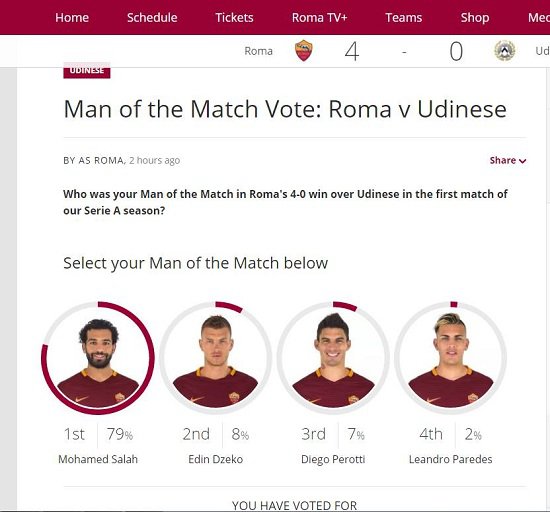 نشر الموقع الرسمى لنادى روما الرياضى، استفتاء لأفضل لاعب فى المباراة واختار الجمهور اللاعب المصرى محمد صلاح بنسبة تصويت 79% ليكتسح القائمة ليأتى بعده لاعب الفريق "إدين دجيكو" والذى حصل على نسبة تصويت 8 بالمائة فقط.