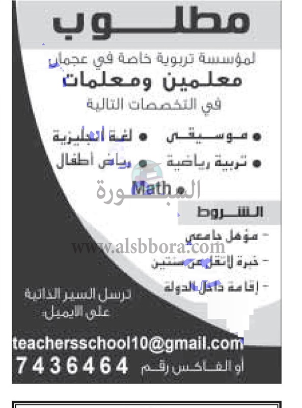 تعلن عدد من المدارس إمارة عجمان في دولة الامارات عن وظائف جديدة للمعلمين والمعلماتوذلك وفقا للاعلان التالي: