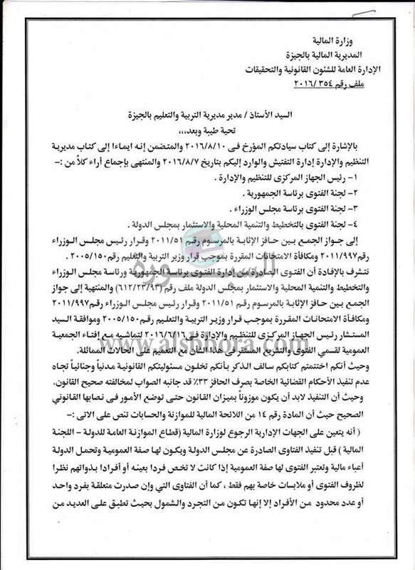 ارسلت مديرية المالية بمحافظة الجيزة التابعة لوزارة المالية فتوى الى مديرية التربية والتعليم بمحافظة الجيزة بشأن عدم جواز الجمع بين مكافأة الامتحانات وحافز الاثابة بالنسبة للمعلمين، ويستعرض موقع السبورة الفتوى المرسلة، والتى جاءت كالتالى.