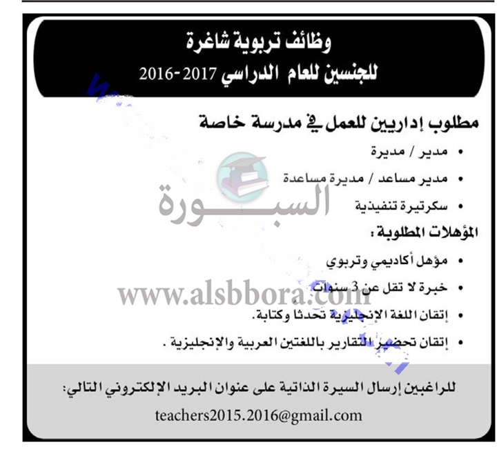 تعلن احدى المدارس الكبرى الخاصة بمملكة البحرين عن حاجتها الى معلمين ومعلمات، وعلى الراغبين فى التقدم ارسال السيرة الذاتية على الايميل المنشور عبر الاعلان التالى: