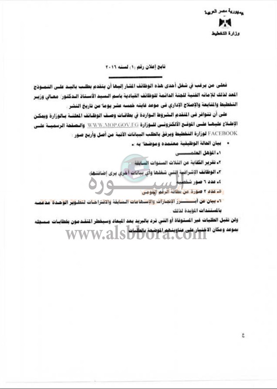 وعلى من يرغب في شغل إحدى هذه الوظائف المشـــار إليها، أن يتقدم بطلب باليد على النموذج المعد لذلك للأمانه الفنية للجنة الدائمة للوظائف القيادية باسم وزير التخطيط في موعد غايته خمسه عشر يومًا من تاريخ النشر، على أن تتوافر في المتقدم الشروط الواردة في بطاقات وصف الوظائف المعلنة بالوزارة ويمكن الاطلاع عليها على الموقع الإلكترونى للوزارة، وأن يقدم بيان الحالة الوظيفية معتمده وموضحًا به المؤهل العالى وتقرير الكفاية عن الثلاث سنوات السابقة والوظائف الإشرافية التي شغلها وأى بيانات أخرى يرى إضافتها و6 صور شخصية و2 صورة من بطاقة الرقم القومي وبيان عن أبرز الإنجازات والإسهامات السابقة والاقتراحات لتطوير الوحدة مدعمة بالمستندات المؤيدة لذلك.
