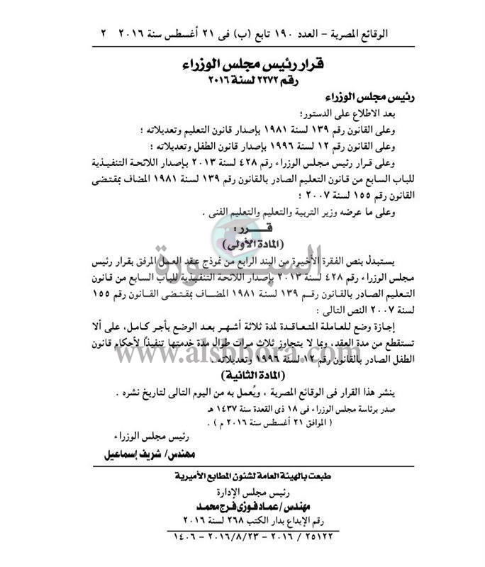 أقر مجلس الوزراء بقرار رقم 2272 لسنة 2016 أن إجازة الوضع للمعلمة المتعاقدة 3 أشهر بأجر كامل.