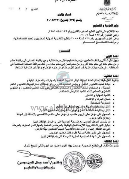 تنشر" السبورة" القرار 275 والخاص بتغيير المسمي الوظيفي من معلم ابتدائي الي اعدادي او ثانوي ومن معلم فصل او مكتبة الي معلم مادة