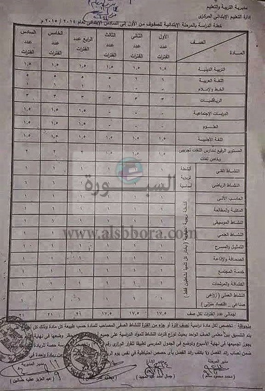 ينشر موقع السبورة عدد فترات جميع المواد الدراسية من الصف الأول إلى السادس بالمرحلة الإبتدائية والتى يتم توزيع بجدول الحصص والنصاب القانونى لكل مادة على حدة وعدد الحصص الخاصة بالأنشطة التربوية الأساسية والأنشطة التربوية الاختيارية.