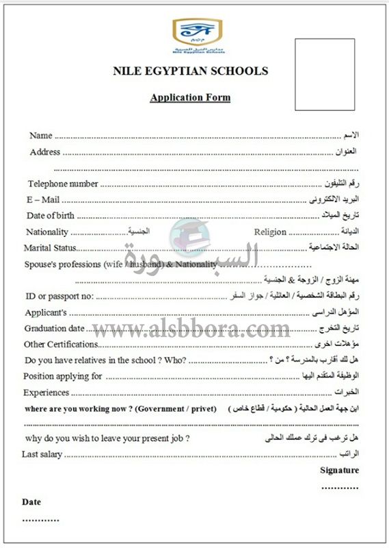 ينشر موقع السبورة استمارة التقديم لوظائف مدارس النيل المصرية التابعة لرئاسة مجلس الوزراء وفروعها بالمحافظات والمعلن عنها فى رسميا لعدد من الوظائف الشاغرة الادارية العليا واعضاء هيئة التدريس لبعض فروع المدارس بالمحافظات لحاجتها لشغل عدد من التخصصات ”مساعدين مديرين، مساعدين مدرسين، مدرسين ومدرسات فى مختلف التخصصات، اخصائيين" لفروع المدارس بالمحافظات وفقا للشروط اللازمة لكل وظيفة والعدد المطلوب فى كل محافظة على أن يتم ارسال الاوراق المطلوبة الكترونيا او يدويا بعد الاطلاع على الشروط اللازمة لشغل كل وظيفة معلن عنها بالفروع ( اكتوبر – العبور – بورسعيد – المنيا – قنا ) ونقدم استمارة التقدم للوظائف ويجب ملأ تلك الاستمارة وارفاقها بالمستندات المطلوبة