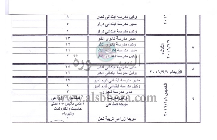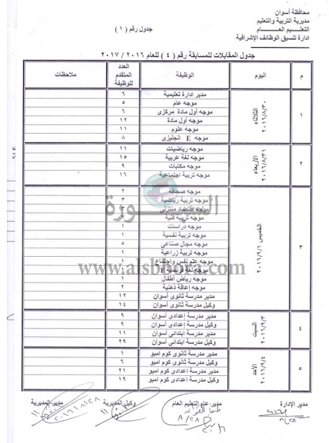 تبدأ مديرية التربية والتعليم بمحافظة اسوان فى الاجراءات النهائية للمسابقة المعلن عنها لشغل الوظائف المطلوبة بالمديرية لشغل عدد من الوظائف المطلوبة لمختلف الادارات والاقسام بالمديرية وفقا للمسابقة رقم 4 لسنة 2016 على ان تبدأ المقابلات للوظائف يوم 30 اغسطس 2016 وفقا للتخصصات والمواعيد الوارده فى الجداول المرفقة .