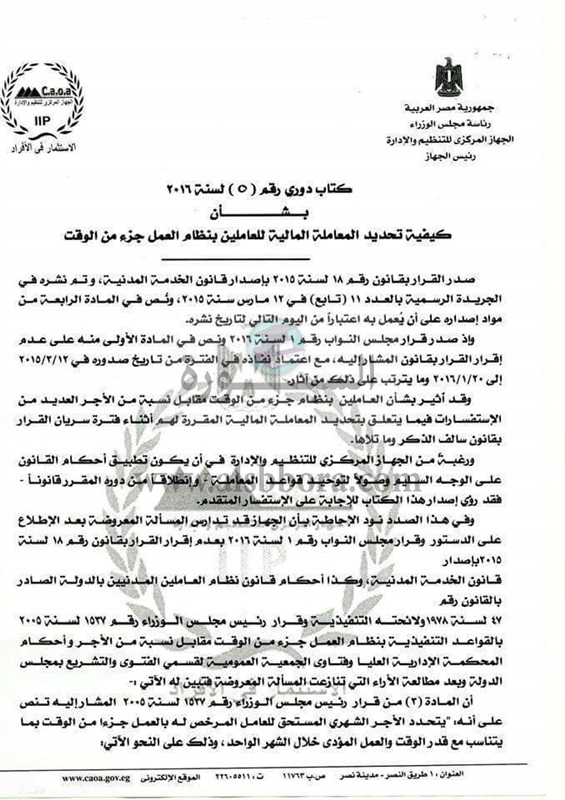 ثانيا : الكتاب الدوري رقم (5) لسنة 2016 الصادر من الجهاز المركزي للتنظيم والادارة لم يأت بجديد وهو استند الي قرار رئيس مجلس الوزراء رقم 1537 لسنة 2005 في شأن العاملين بنظام جزء من الوقت مقابل نسبة من الاجرولم يشر الي التعديل الذي اشرنا اليه في 2006