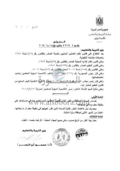 ينشر موقع السبورة القرار الوزارى الخاص بشأن موافقة وزارة المالية على صرف بدل الاعتماد المقرر قانونا للمعلمين بعد تعيينهم بشهر، ولم يذكر القرار شرط موافقة المحافظ على الصرف.