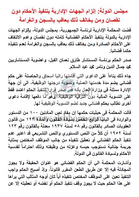 قضى مجلس الدولة بإلزام الجهات الإدارية بتنفيذ الأحكام دون نقصان ومن يخالف ذلك يعاقب بالسجن والغرامة.