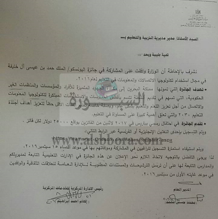 ارسلت وزارة التربية والتعليم فاكسا الى جميع المديريات التعليمية على موافقتها المشاركة فى جائزة اليونسكو/ الملك حمد بن عيسى ال خليفة فى مجال استخدام تكنولوجيا الاتصالات والمعلومات فى التعليم لعام 2016.