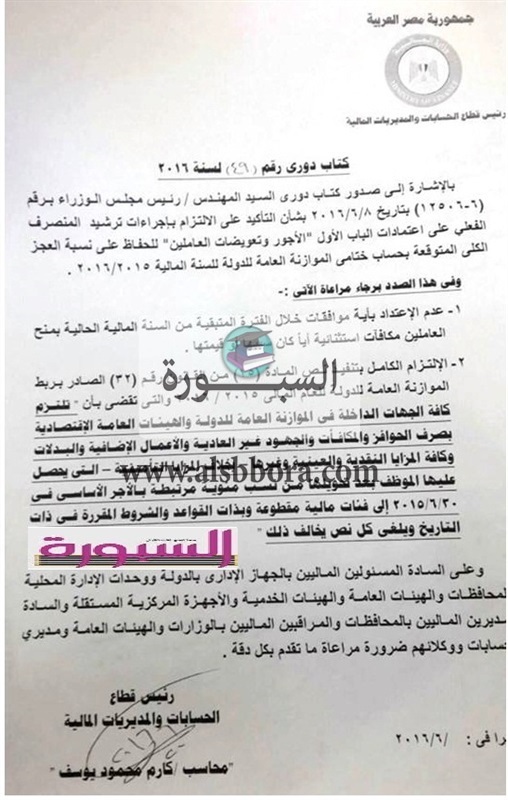 وأضاف الكتاب الدورى "بناء على ذلك يجب على جميع المسئولين الماليين بالجهاز الادارى للدولة ووحدات الادارة المحلية بجميع الحافظات والهيئات العامة والهيئات الخدمة والاجهزة المركزية المستقلة ضرورة مراعاة الدقة فى كل ذلك".
