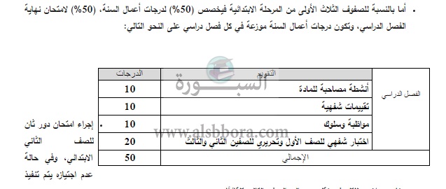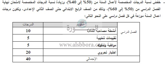خفض نسبة الدرجات المخصصة لأعمال السنة من (50% إلى 40%)، وزيادة نسبة الدرجات المخصصة لامتحان نهاية الفصل الدراسي من (50% إلى 60%)، وذلك من الصف الرابع الابتدائي حتى الصف الثاني الإعدادى، وتكون درجات اعمال السنة موزعة في كل فصل دراسي على النحو التالي: