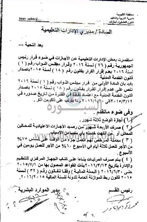 ينشر "السبورة" القرار الوزاري الخاص باحتساب اجازات المعلمين بعد إقرار مجلس النواب لقانون الخدمة المدنية الجديد.. واليكم نص القرار.