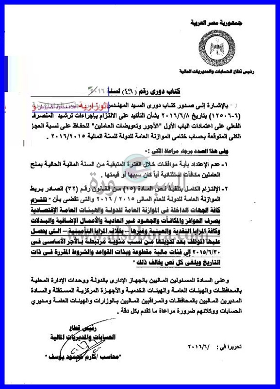 وأضاف الكتاب الدورى "بناء على ذلك يجب على جميع المسئولين الماليين بالجهاز الادارى للدولة ووحدات الادارة المحلية بجميع الحافظات والهيئات العامة والهيئات الخدمة والاجهزة المركزية المستقلة ضرورة مراعاة الدقة فى كل ذلك".
