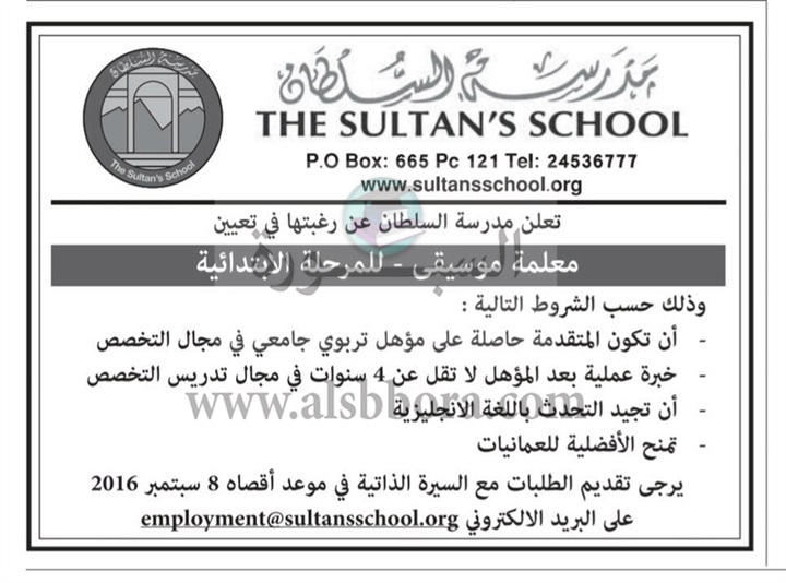 تعلن مدرسة السلطان بدولة سلطنة عمان عن حاجتها الى معلمات، وعلى الراغبين فى التقدم ارسال السيرة الذاتية عبر الايميل المنشور فى الاعلان التالى: