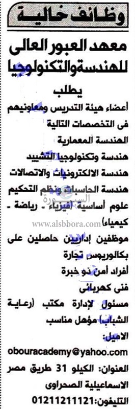 يعلن معهد العبور للهندسة والتكنولوجيا عن حاجته الى أعضاء هيئة التدريس، وعلى الراغبين فى التقدم ارسال السيرة الذاتية عبر الايميل المنشور فى الاعلان الذى نشر فى جريدة الاهرام اليوم الجمعة الموافق 2 سبتمبر 2016.