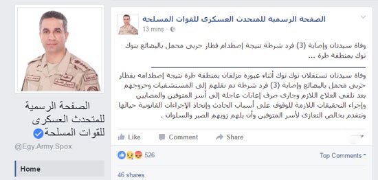 وذكرت الصفحة الرسمية للمتحدث العسكرى للقوات المسلحة، أنه جارى صرف إعانات عاجلة إلى أسر المتوفين والمصابين، وإجراء التحقيقات اللازمة للوقوف على أسباب الحادث واتخاذ الإجراءات القانونية حيالها، مضيفة: "نتقدم بخالص التعازى لأسر المتوفين وأن يلهم ذويهم الصبر والسلوان".
