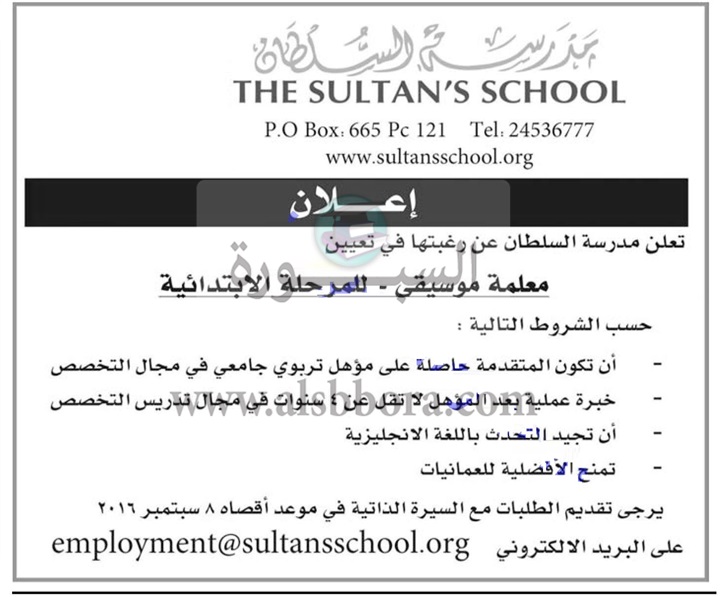تعلن مدرسة السلطان العمانية عن وظائف جديدة للمعلمين علي أن يكون أخر موعد للتقديم 8 سبتمبر المقبل وذلك وفقا لنص الاعلان التالي: