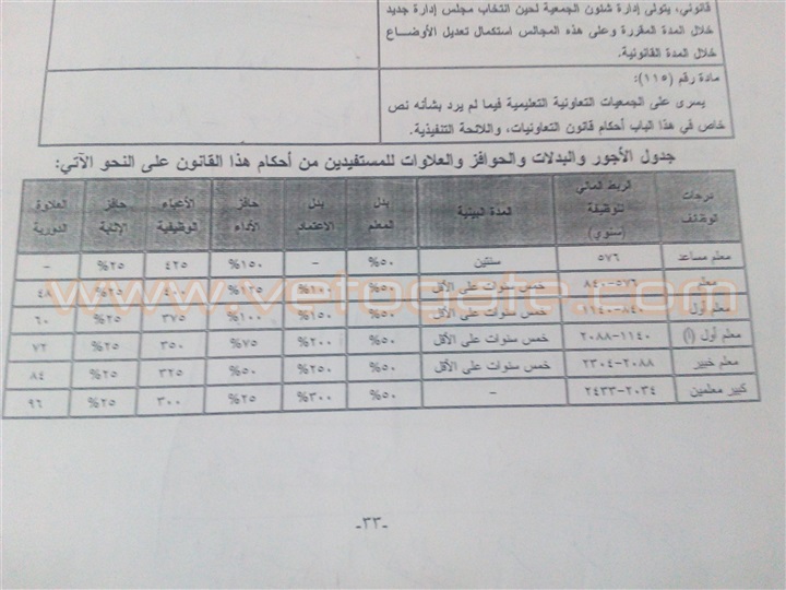 ووضح الجدول الأجور حسب درجات الوظائف، حيث يأخذ المعلم المساعد 576 جنيه كربط مالي للوظيفة "سنوي"، وحدد المدة البينية بسنتين وعلى أن يكون له حافز الأداء 150%، وحدد الربط المالي لكبير المعلمين 2034 و2433، ولم يحدد له مدة بينية، ويكون له بدل اعتماد 300%.