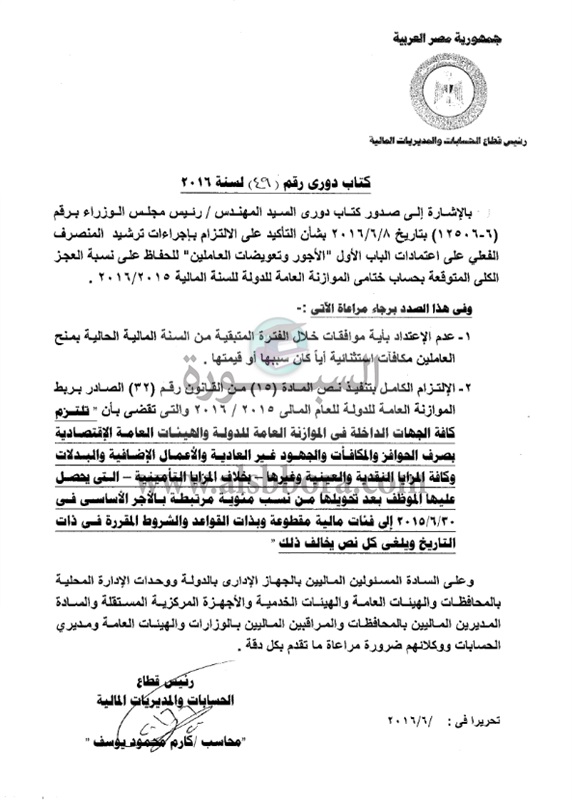 وأضاف الكتاب الدورى "بناء على ذلك يجب على جميع المسئولين الماليين بالجهاز الادارى للدولة ووحدات الادارة المحلية بجميع الحافظات والهيئات العامة والهيئات الخدمة والاجهزة المركزية المستقلة ضرورة مراعاة الدقة فى كل ذلك".