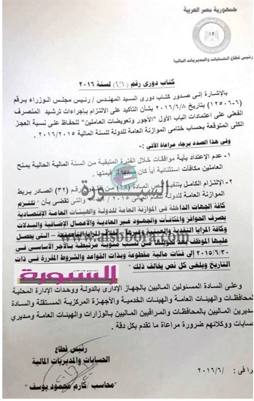 وأضاف الكتاب الدورى "بناء على ذلك يجب على جميع المسئولين الماليين بالجهاز الادارى للدولة ووحدات الادارة المحلية بجميع الحافظات والهيئات العامة والهيئات الخدمة والاجهزة المركزية المستقلة ضرورة مراعاة الدقة فى كل ذلك".