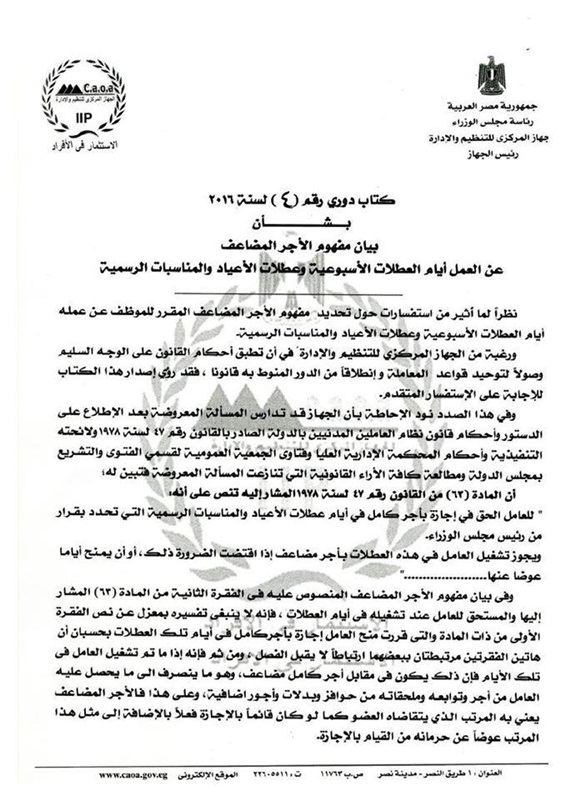 ينشر موقع السبورة الكتاب الدورى رقم 4 لسنة 2016 بشأن بيان مفهوم الأجر المضاعف عن العمل ايام العطلات الأسبوعية وعطلات الأعياد والمناسبات الرسمية.
