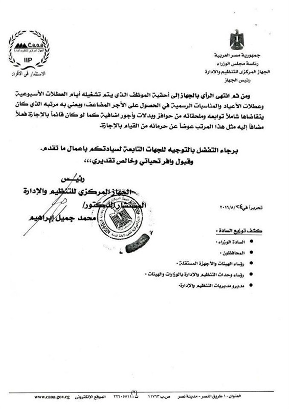 بالمستندات| ننشر بيان الأجر المضاعف عن العمل ايام العطلات الأسبوعية وعطلات الأعياد والمناسبات الرسمية