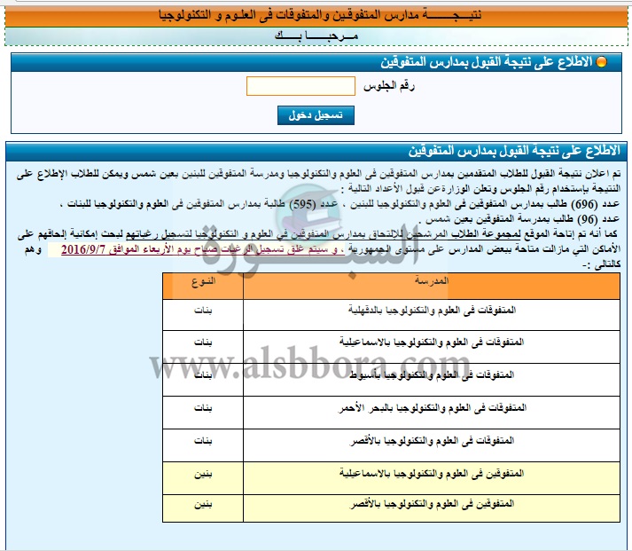 وتتقدم الوزارة بالتهنئة للطلاب الذين تم قبولهم، وتتمنى التوفيق لمن لم يتم قبوله، كما أنه تم إتاحة الموقع لمجموعة الطلاب المرشحين للالتحاق بمدارس المتفوقين في العلوم والتكنولوجيا لتسجيل رغباتهم لبحث إمكانية إلحاقهم على الأماكن التي ما زالت متاحة ببعض المدارس على مستوى الجمهورية.