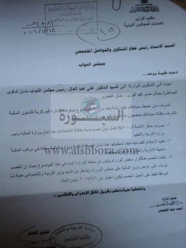 عاجل.. "التعليم" تخلى مسئوليتها من صرف حافز الاثابة 200% للمعلمين.. وتنفيذ الاحكام القضائية.. وتلقى بالكرة فى ملعب المالية.. ننشر الفاكس