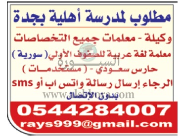 تعلن احدى المدارس الأهلية بمنطقة جدة بالمملكة العربية السعودية عن حاجتها الى معلمات فى جميع التخصصات، وعلى الراغبين فى التقدم ارسال السيرة الذاتية على الايميل المنشور عبر الاعلان التالى: