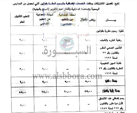 ينشر موقع المصروفات الدراسية للعام الدراسى الجديد 017/2016، والتى تستحق على التلاميذ والطلاب فى جميع المراحل التعليمية ابتداء من رياض الاطفال ومرورا بالمرحلة الابتدائية ثم الاعدادية وختاما ، حيث جاءت المصاريف مبينة فى الجدول التالى: