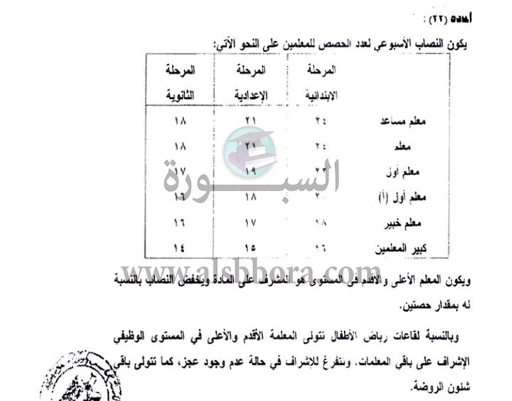 تعرف على النصاب الأسبوعى لعدد الحصص للمعلمين.. معلم مساعد ابتدائى 24.. اعدادى 21.. ثانوى 18.. كبير معلمين ابتدائى 16.. اعدادى 15.. ثانوى 14