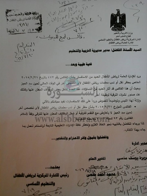 التعليم: عجز معلمات رياض الاطفال لايمنع الترقيات الى وكيل أو مدير مدرسة.. ننشر فاكس الوزارة