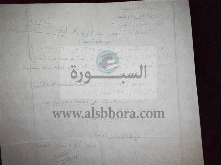 ينشر موقع السبورة كتاب الوزارة رقم 1394، والذى ورد الى مديرية التربية والتعليم بمحافظة الدقهلية فى 10/10/2012 بشأن الإفادة بالرأى حيال ما يتبع فى حالات ضم مدة الخبرة العملية السابقة للذين كانوا يعملون بالعقود بوظيفة معلم مساعد وتم تثبيتهم بوظيفة معلم وقد تضمن الاتى:-