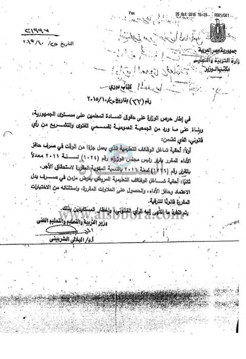 التعليم: أحقية المعلم المريض مرض مزمن فى صرف بدل الاعتماد وحافز الآداء والحصول على العلاوات المقررة واستثنائه من الاختبارات المقررة للترقية.. ننشر الفاكس