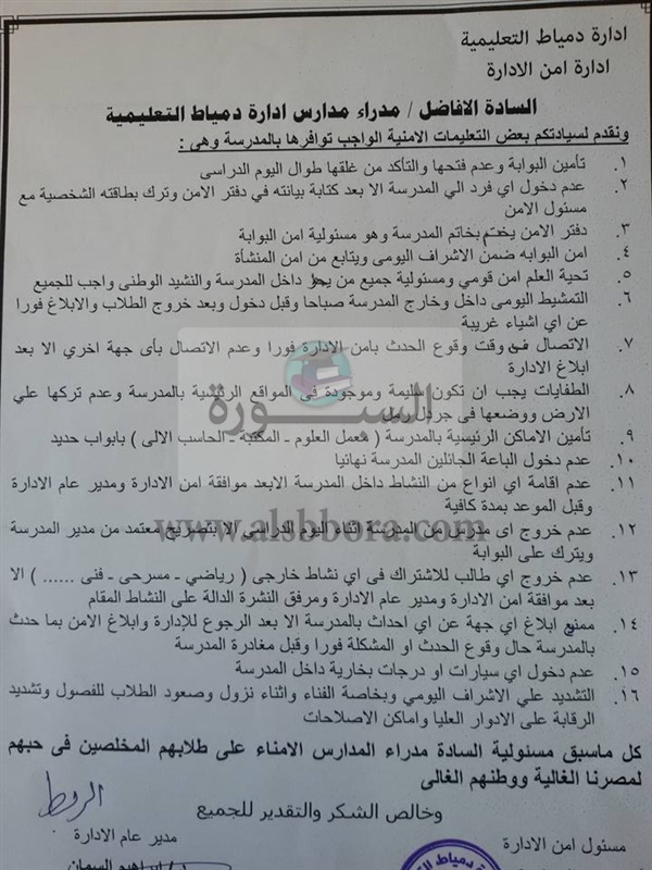 أعلنت ادارة دمياط التعليمية عن بعض التعليمات الأمنية الواجب توافرها بالمدرسة، والتى أرسلتها الى مدارس المدارس، وجاءت كالتالى: