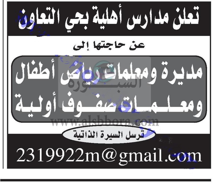 تعلن احدى المدارس الاهلية بحى التعاون بالمملكة العربية السعودية عن حاجتها الى مديرة مدرسة ومعلمات رياض أطفال وصفوف أولية، وعلى الراغبين فى التقدم إرسال السيرة الذاتية على الايميل المنشور عبر الاعلان التالى: