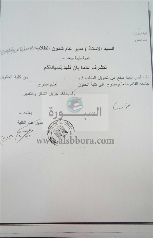 وأكد المركز في بيان له، أنه ورد العديد من الطلبات من دارسين يطلبون التحويل من برامج القانون من جامعة القاهرة إلى جامعات أخرى، وتبين أن بعضهم لم يقدم موافقة جهة عمله على الالتحاق بالجامعة الجديدة، وهو شرط للالتحاق التعليم المفتوح، وبعضهم لم يقدم موافقة الجامعة الأخري على التحويل وبعضهم في سنوات الدراسة الأخيرة، مما يتعارض مع القواعد الأكاديمية المتعارف عليها وأحدهم أرفق موافقة جامعة أخرى علي قبول تحويله.