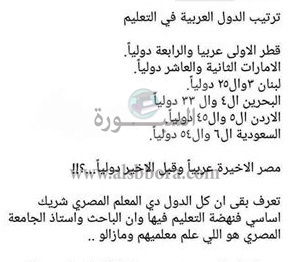 نشر نشطاء التعليم على موقع التواصل الاجتماعى "فيسبوك" كوميكس يوضح ترتيب الدول العربية فى التعليم حيث جاءت قطر فى المركز الأول عربيا والرابع دوليا، بينما جاءت الامارات الثانية عربيا والعاشر دوليا، بينما جاءت مصر التى علمت العالم الأخير عربيا، وقبل الأخير دوليا.