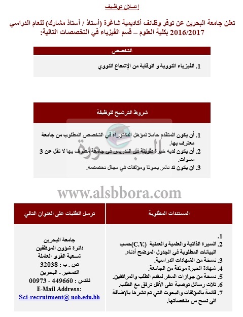 تعلن جامعة البحرين عن توفر وظائف أكاديمية شاغرة (أستاذ / أستاذ مشارك) للعام الدراسي 2016/2017 بكلية العلوم – قسم الفيزياء في التخصصات التالية: