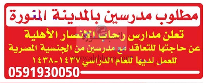 مدرسة رحاب الأنصار السعودية تعلن عن وظائف شاغرة للمعلمين المصريين.. ننشر نص الاعلان