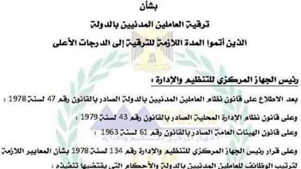 ننشر نص االقرار 246 بتخفيض المدد البينية للترقية للعاملين بالدولة.. «6 سنوات للدرجة الأولى و8 للثانية و5 للدرجات الأقل»